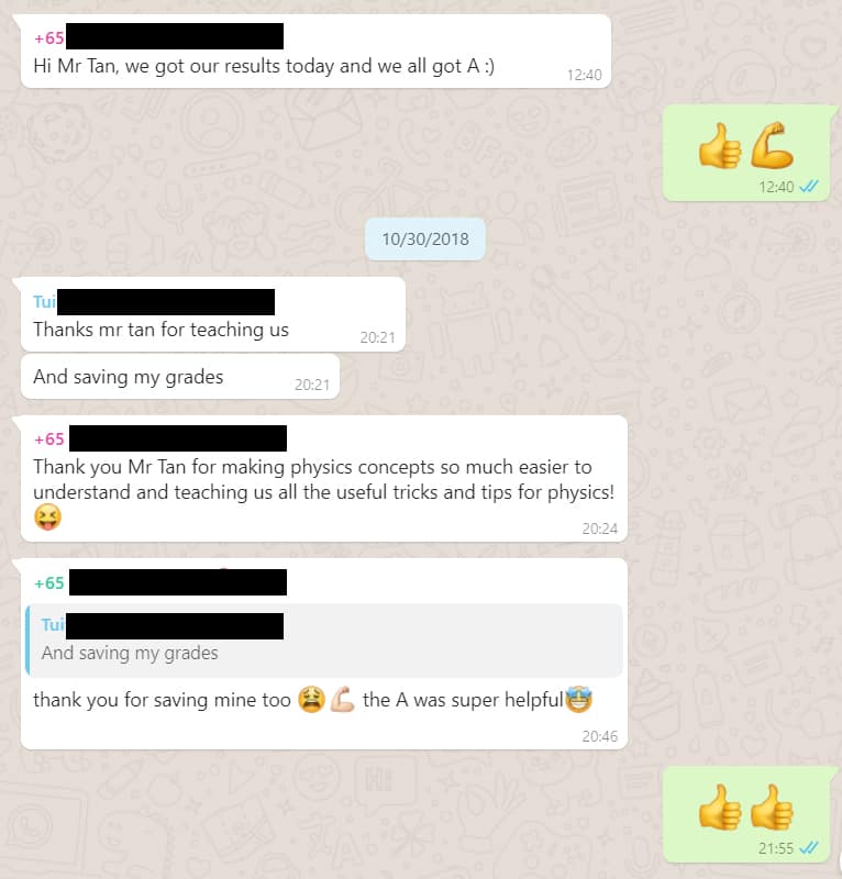 Also, he created a booklet that pinpoints the key information in each chapter and highlights things that we must memorize. It was a real treasure to me when I was studying for my exams. Mr Tan also allows us to contact him whenever we have any physics questions and he would always give a detailed explanation. In addition, we can consult him outside lesson time if we have any problems in physics which was very helpful to me as I had a lot of queries a few days before my physics papers. I have never seen a teacher with such a strong passion in physics other than Mr Tan. Thank you so much Mr Tan!