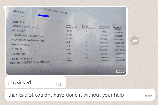 Furthermore, his affable and easy-going personality makes us feel very comfortable with raising questions in class, which he will very patiently explain until we fully understand. He’s always willing to go the extra mile to help us improve our physics — staying back after lessons to go through challenging questions with us and always being available on Whatsapp to clarify our doubts!
