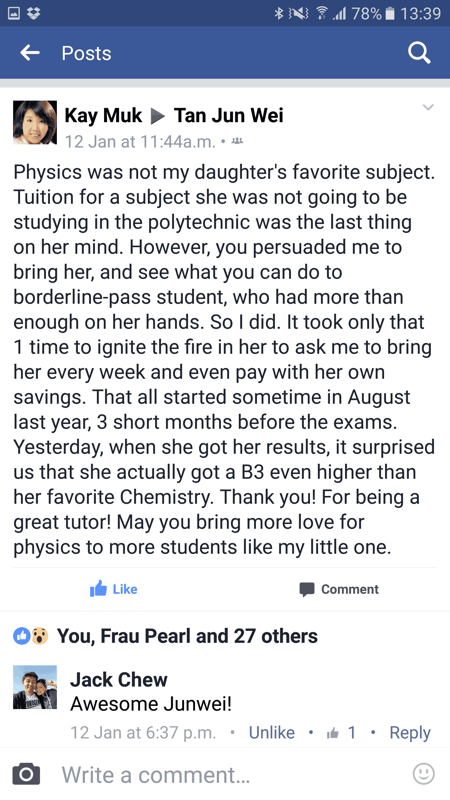 After finishing his lessons, Physics was no longer a challenging subjects. I could easily keep up with lessons in school and I also grew a liking for Physics. I will continue having a curious mind for Physics thanks to Mr Tan.